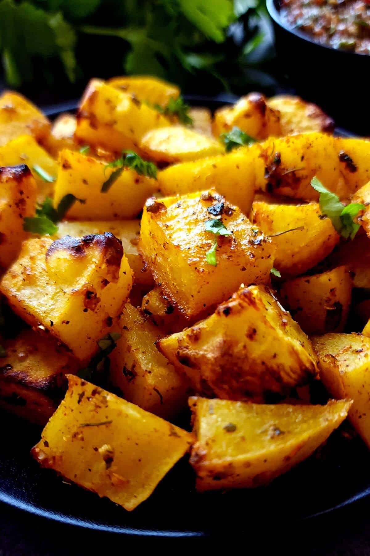Indian roasted potatoes are crispy on the outside and tender inside, tossed with aromatic curry spices and herbs. Each bite of these potatoes bursts with warm, earthy flavors of turmeric, cumin, and coriander. Perfect as a side dish or a flavorful snack.